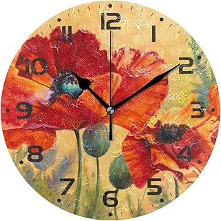 Naanle レッド ポピー フラワー フローラルパターン デザイン ラウンド/スクエア/ダイヤモンド アクリル 壁時計 油絵 ホーム オフィス 学校 装飾 クリエイティブ デュアル使用 時計 アート
